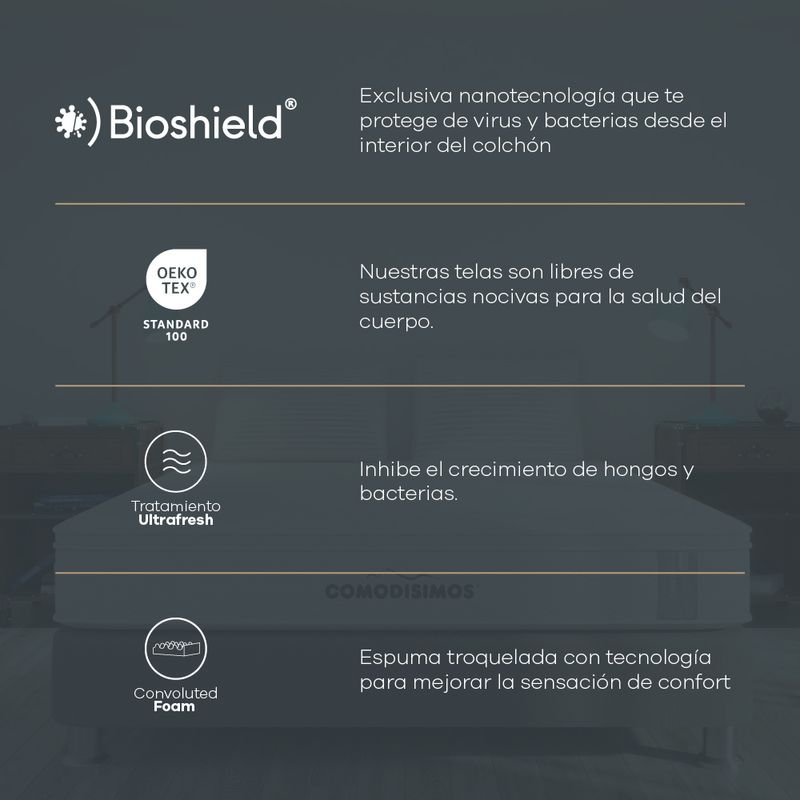 Material transpirable que tiene una alta capacidad de frescura, gracias a su sistema de circulación de aire que evita que se concentre el calor en el interior del colchón. Esto permite tener descansos más agradables y confortables.